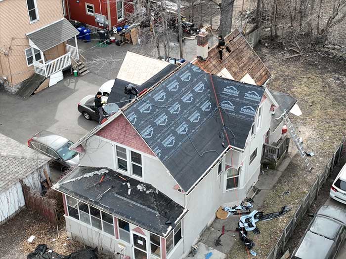 In this picture, we have removed the old, damaged shingles, preparing the surface for new installations. This stage involves careful inspection and necessary repairs to the underlying structures to ensure a solid foundation for the new materials. Our skilled professionals are meticulously installing high-quality shingles, paying close attention to detail to ensure durability and aesthetic appeal